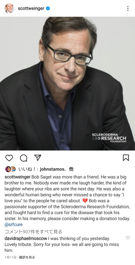 「ボブ・サゲットは友人以上の存在だった。僕にとってのお兄ちゃんみたいな存在。彼よりも僕を笑わせてくれる人は他にいなかった。次の日が腹筋が痛くなるほどね。彼は、大事な人たちに「愛してる」というチャンスがあれば決して逃さない素晴らしい人でもあった。ボブは強皮症研究所の熱心な支援者でもあり、彼の姉を奪ったその病気の治療法を探すために尽力していたんだ。彼の思い出と共に、ぜひ寄付を考えてみてください。」