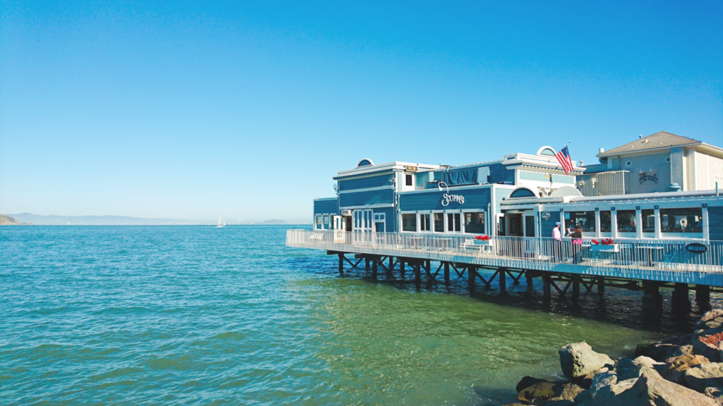 海の上から眺めるサウサリートとサンフランシスコの街並み、そしてゴールデンゲートブリッジは、遮るものが何もないまさに絶景。絶対に体験してほしい私の一押しです。ちなみに、サウサリートでよく紹介されるレストラン スコマズ (Scoma’s) は、サンフランシスコのフィッシャーマンズワーフが本店の老舗です。サウサリートで食べられなくても、予約しておいてフェリーで戻った後にディナーで訪れることができます。充実したデイトリップになるよう、しっかり計画しておきましょう♪